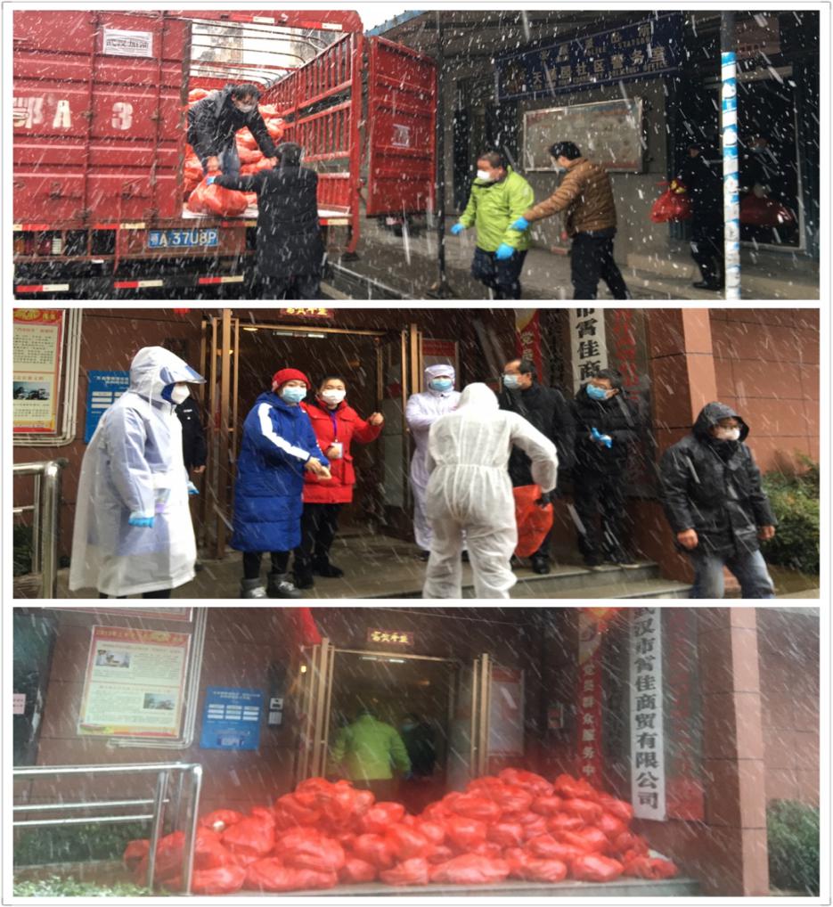 2月15日,农业集团总经理钟细明同志冒着风雪,带领农业集团突击队员向包保社区送去10箱水果、100份蔬菜等慰问物资。同日,集团公司党委委员、副总经理戴绍波同志带领集团公司本部4名党员,紧急调度,在寒风凛冽、雨雪交加的恶劣天气协调购买160份新鲜蔬菜捐赠到硚口区长丰街天顺园南社区和永利新城社区,为小区封闭管理不便出行的孤寡老人、社区一线防疫工作者送去一片爱心。